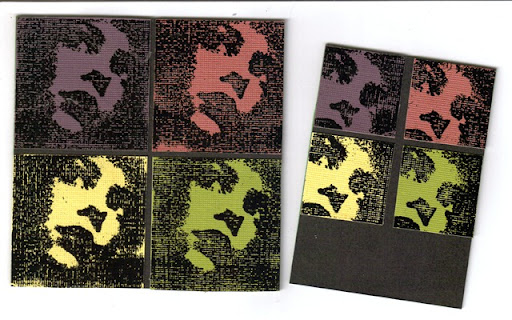 I was particularly pleased with this Warholesque effect. I borrowed the stamp from my friend Sheila so I cannot record the details. I stamped and embossed it on coloured card using black embossing powder and the ever useful Versamarks ink pad. Black embossing powder is quite tricky to work with - if anyone knows why, please tell!